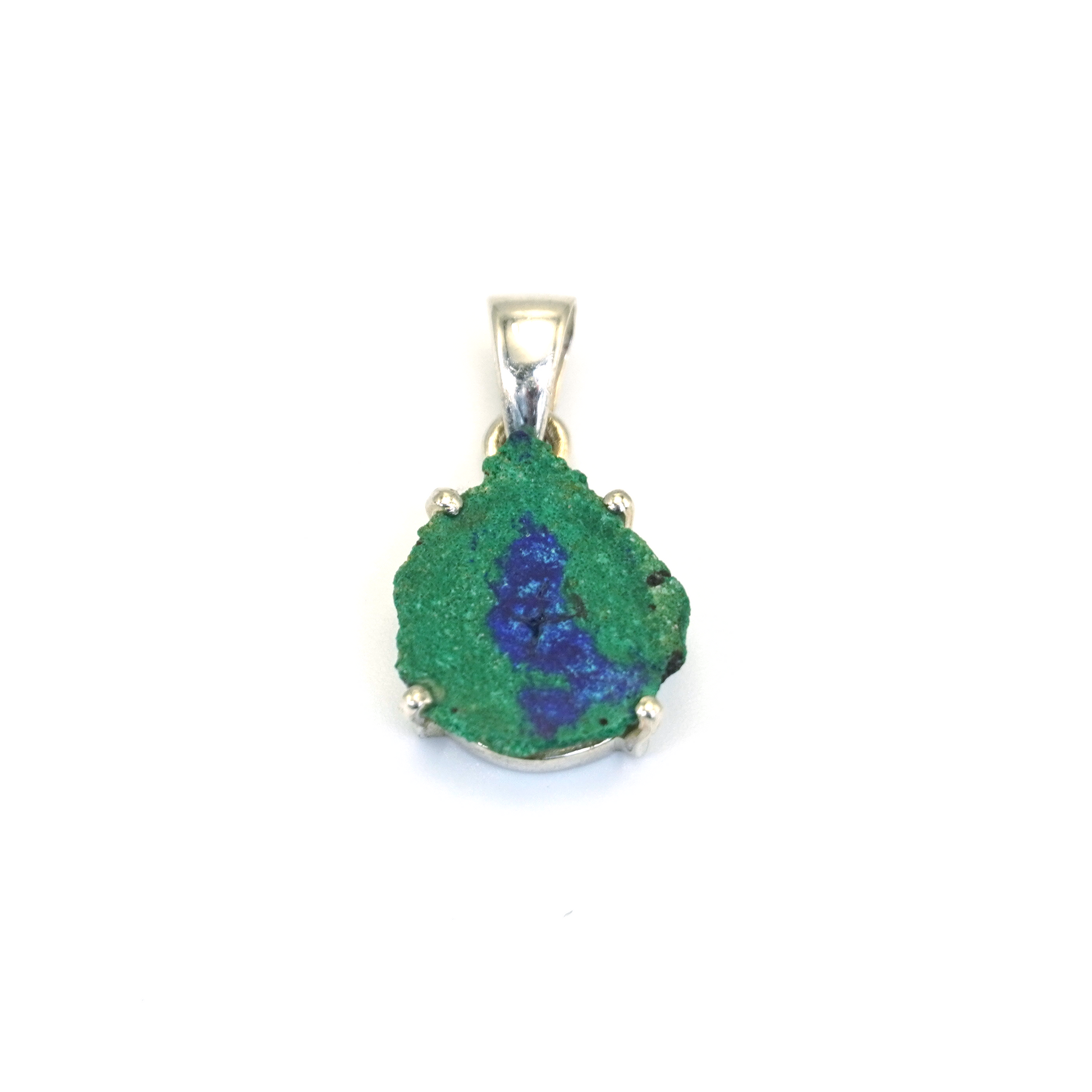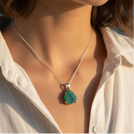 Collar de Estalactita de azurita sobre malaquita del Congo. Una pieza rara y de colección. Con sus formas orgánicas y sus tonos verdes y azules, es un espectáculo de la naturaleza convertido en joya.